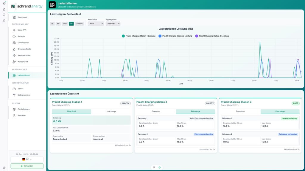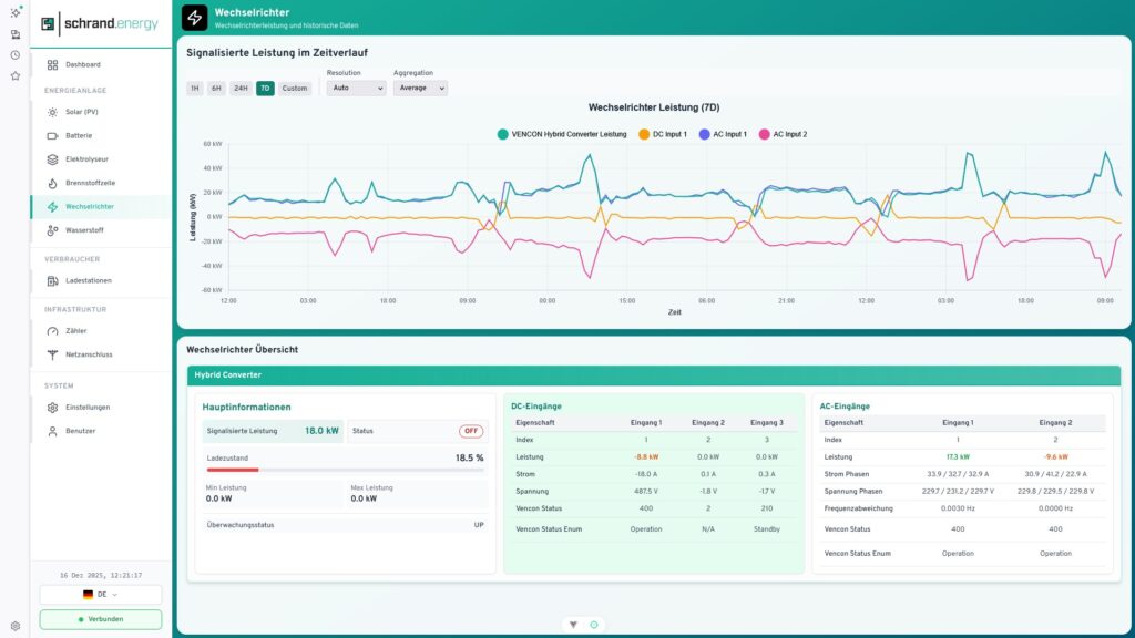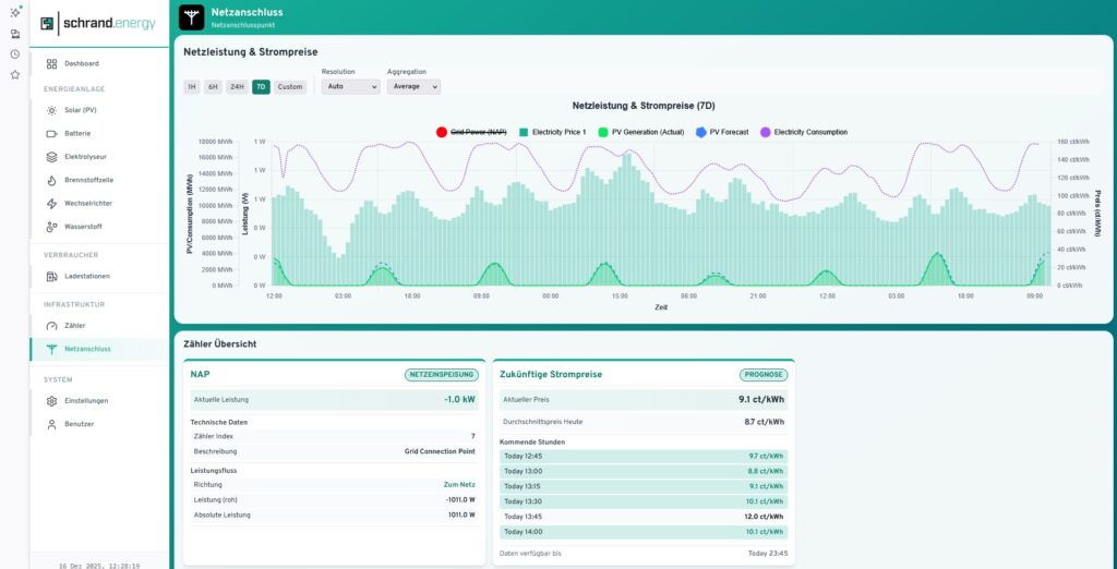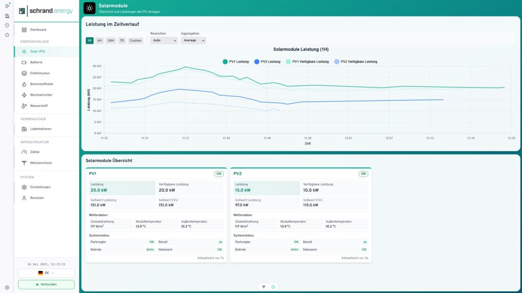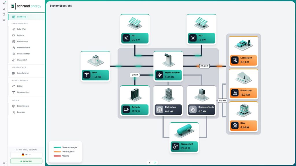Heute lohnt sich die Wintersonne richtig: Dank intelligenter Steuerung ist das System seit dem späten Vormittag hochgefahren – die Elektrolyse produziert Wasserstoff. Das Energiemanagementsystem wertet dabei die Lastgänge kontinuierlich aus, erkennt Spitzen und optimiert die Fahrweise in Echtzeit. So nutzen wir verfügbare, erneuerbare Energie genau dann, wenn sie sinnvoll ist.